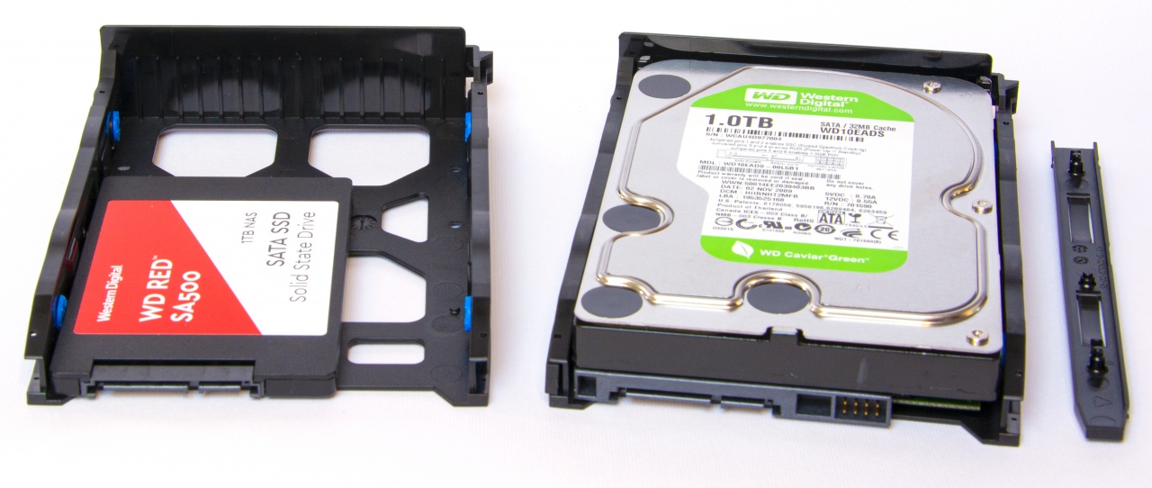 I cassetti accettano dischi sia da 3,5 che da 2,5 polliciSempre frontalmente è presente una interfaccia USB 3.0 con un pulsante per la copia immediata dei file e una serie di indicatori che consentono di verificare in real time il funzionamento dell’apparecchio. E' presente anche la spia che segnala l’attività delle porte di rete, quella che certifica l’inserzione di un dispositivo USB e quelle relative ai quattro dischi.