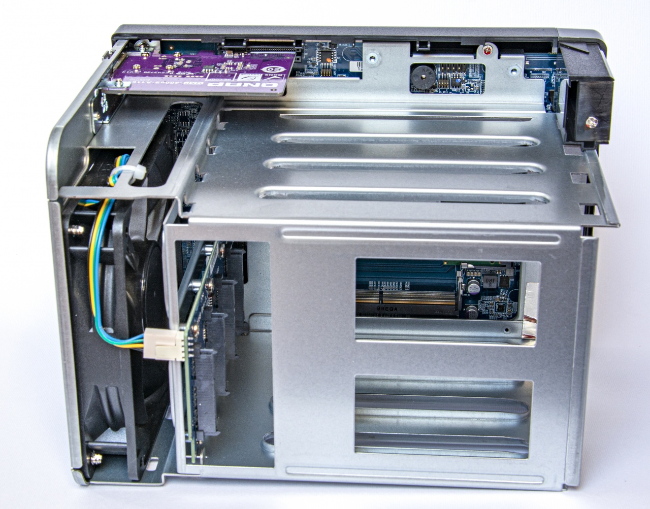 L’interno mostra una costruzione molto ordinata, con uno chassis in metallo molto robusto in grado di contenere le vibrazioni dei dischi. Sul lato destro troviamo la mainboard con tutti i circuiti elettronici dotata di uno slot PCIe e di due alloggiamenti per memorie di tipo SODIM in cui possono essere inseriti moduli da 4 Gbyte (per un totale di 8 Gbyte massimi). Accedere a questi slot è facile, basta infatti estrarre i quattro cassetti frontali con gli HD.