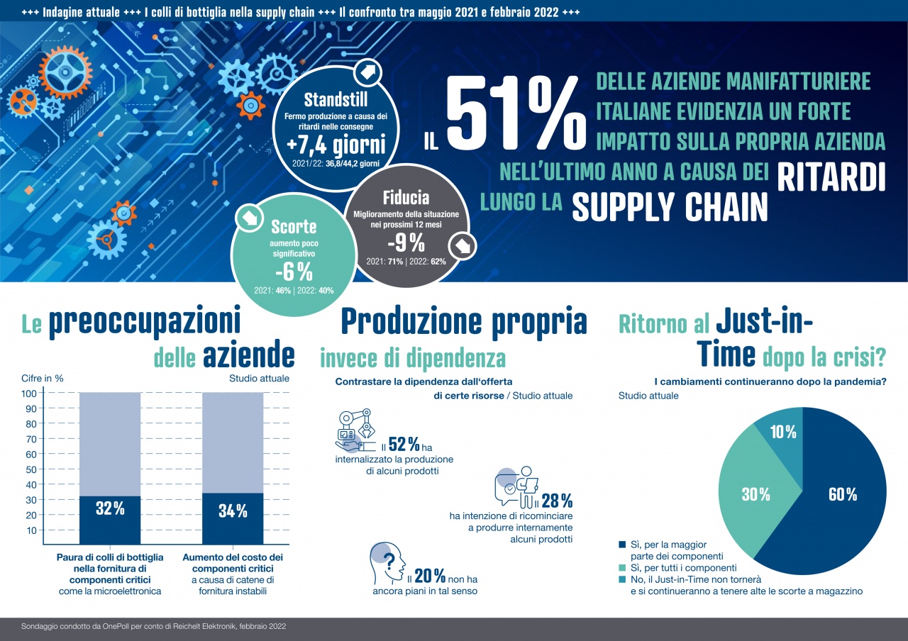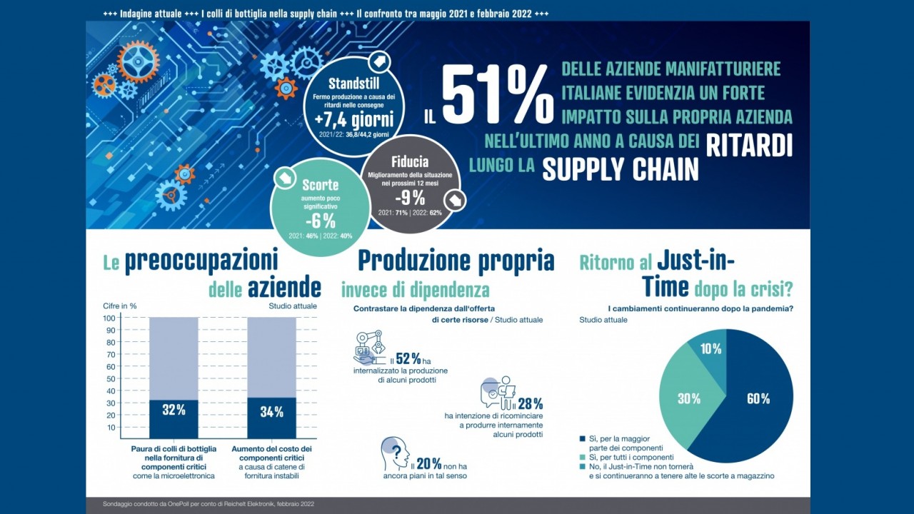 i risultati della ricerca di reichelt elektronik, commissionata all'istituto di ricerca OnePoll, evidenziano importanti conseguenze della crisi della supply chain per il 51% delle aziende del settore manifatturiero italiano. Dal primo semestre del 2021 ad oggi, i dati mostrano un aumento del 20% dei fermo produzione verificatisi in media durante gli ultimi dodici mesi, per un totale di 44,2 giorni (in media), a causa dei ritardi e dei rallentamenti lungo la catena di approvvigionamento.
