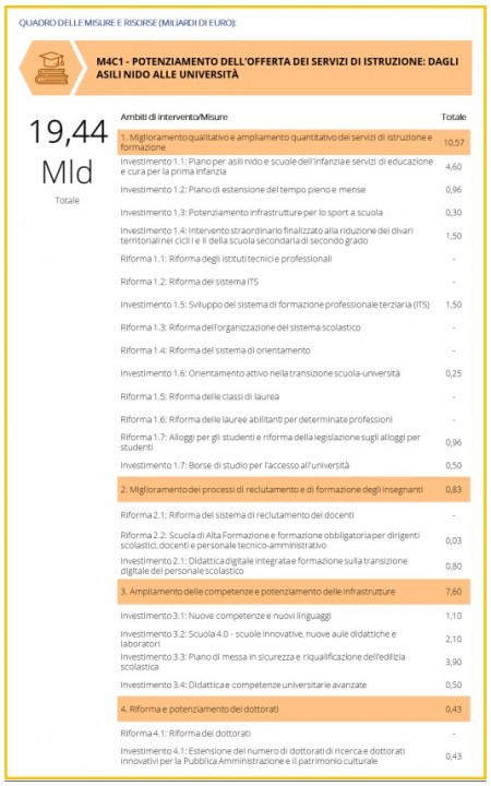 A giugno, inoltre, si era conclusa l’assegnazione di 480 milioni di euro per portare Internet ultraveloce a circa 10mila scuole e oltre 12mila strutture sanitare italiane. L’appalto ha visto vincitori Tim, Fastweb e l’operatore Intred (per la sola Lombardia) e, di conseguenza, ha fatto lavorare i partner degli operatori di telefonia. Ancora, tra le varie iniziative, c’è da ricordare il miliardo di euro e poco più stanziati per il piano di edilizia scolastica e i 3,9 miliardi di euro destinati alla messa in sicurezza delle scuole. Queste ultime comprese all’interno delle 11 linee di intervento previste nella Missione 4 del PNRR dedicata all’Istruzione e alla Ricerca, che ha allocato ben 19,44 miliardi di euro per il “potenziamento dell’offerta dei servizi di istruzione dagli asili nido alle università” erogabili in cinque anni (2021-2026).