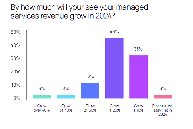 Prima di passare la parola per i dettagli alle persone di Canalys, Pagliuca ha sottolineato che dallo studio “sono emerse alcune sorprese, la prima delle quali è quella dell'ottimismo sulla crescita: nonostante le forti sfide macroeconomiche presenti praticamente in ogni settore, gli MSP, che sono 335mila in tutto il mondo, mostrano di essere molto ottimisti, con il 64% di tutti i partecipanti al nostro sondaggio che hanno detto che cresceranno a doppia cifra nel 2024”. Analizzando più da vicino il dato sulla crescita dei servizi gestiti, si vede che solo il 3% non prevede incrementi, cui fa da contraltare una percentuale analoga che prevede di crescere più del 40%.