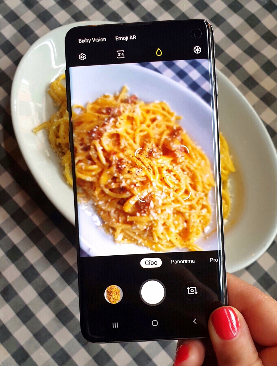 non ignorare la composizione: la fotografia deve raccontare una storia, e la carbonara ne ha tanta alle spalle. Largo quindi alla tradizione, ai colori caldi delle classiche trattorie romane e agli sfondi a quadri rossi e bianchi. Mai dimenticare qualche ingrediente sullo sfondo, magari un uovo e un tagliere con qualche striscia di guanciale, per esaltarne ancora di più il senso di genuinità. Attenzione però a non esagerare con i dettagli: la carbonara è già abbastanza ricca. La fotocamera ultra-grandangolare di Galaxy S10 grazie all'angolo di visione di 123 gradi permette in modo semplice di immortalare una porzione più ampia della scena, quindi la composizione nella sua totalità.