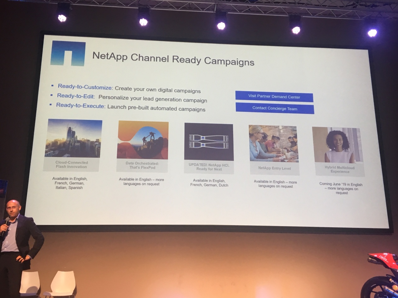 Un marketing moderno A disposizione dei partner inoltre una ‘macchina’ marketing molto efficiente in grado di proporre ai partner promozioni, strumenti e tool per abilitare e agevolare al meglio le loro attività. “Oggi tutto è in trasformazione: il mondo è molto diverso da qualche anno fa e il 65% del ciclo di acquisto dei clienti avviene fuori dal controllo del vendor e quindi anche dei partner. Per questo è fondamentale fornire strumenti adeguati ai partner al fine di rispondere e aderire alle esigenze del cliente prima che si faccia un’idea compiuta su come agire, magari verso un competitor”, sottolinea Denis Nalon, Marketing Manager, NetApp Italia. In questo senso, il vendor mette a disposizione dei partner un’offerta completa di strumenti marketing veloci da utilizzare e pronti all’uso per supportarli nelle loro attività con i clienti, compreso un servizio di concierge in lingua italiana.