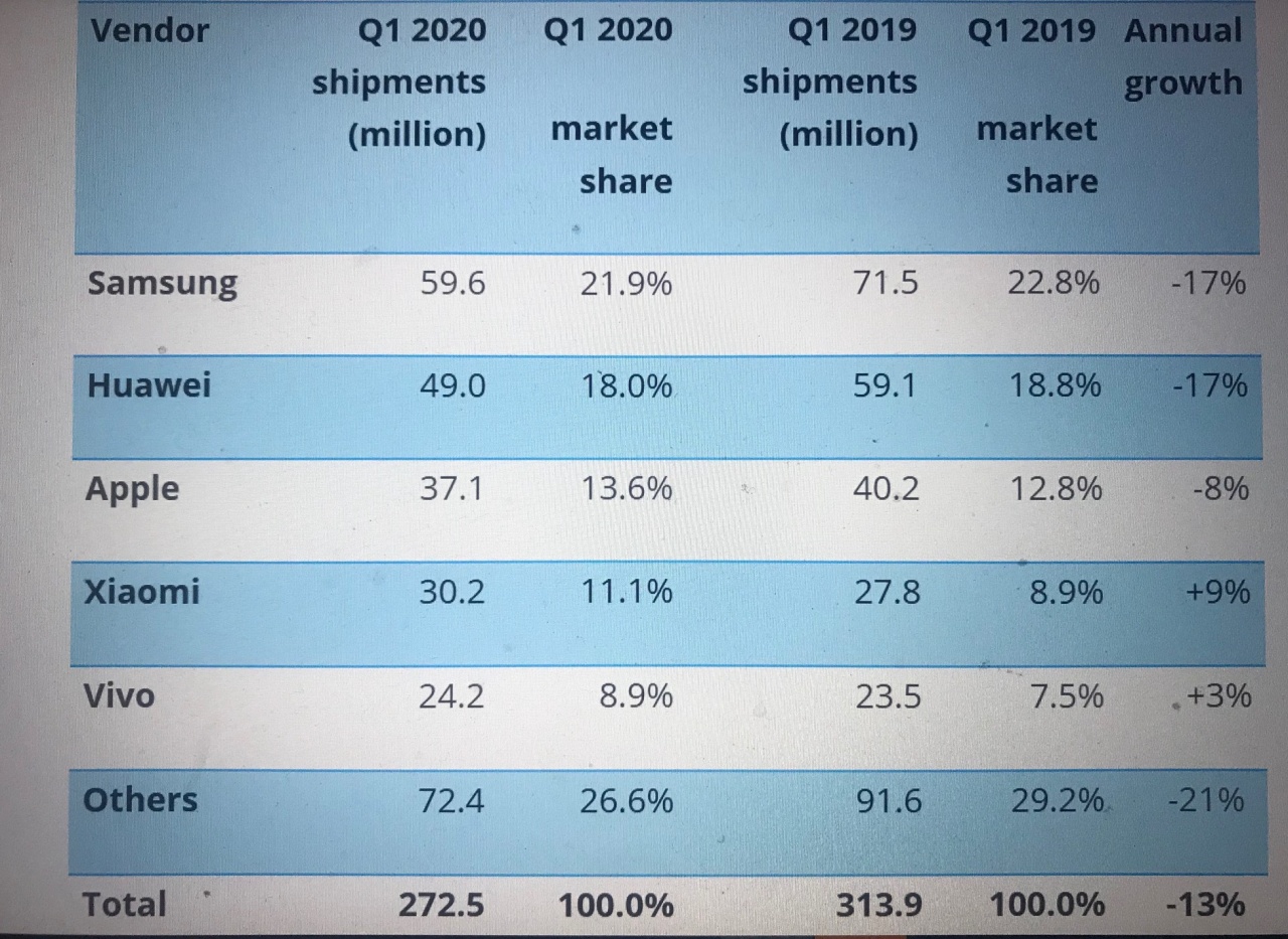 il mercato degli smartphone è sceso a 285 milioni di unità, riportando un secondo trimestre consecutivo in caduta libera, dovuto ai blocchi degli ordini nel periodo di pandemia di COVID-19 proseguiti ad aprile e maggio.