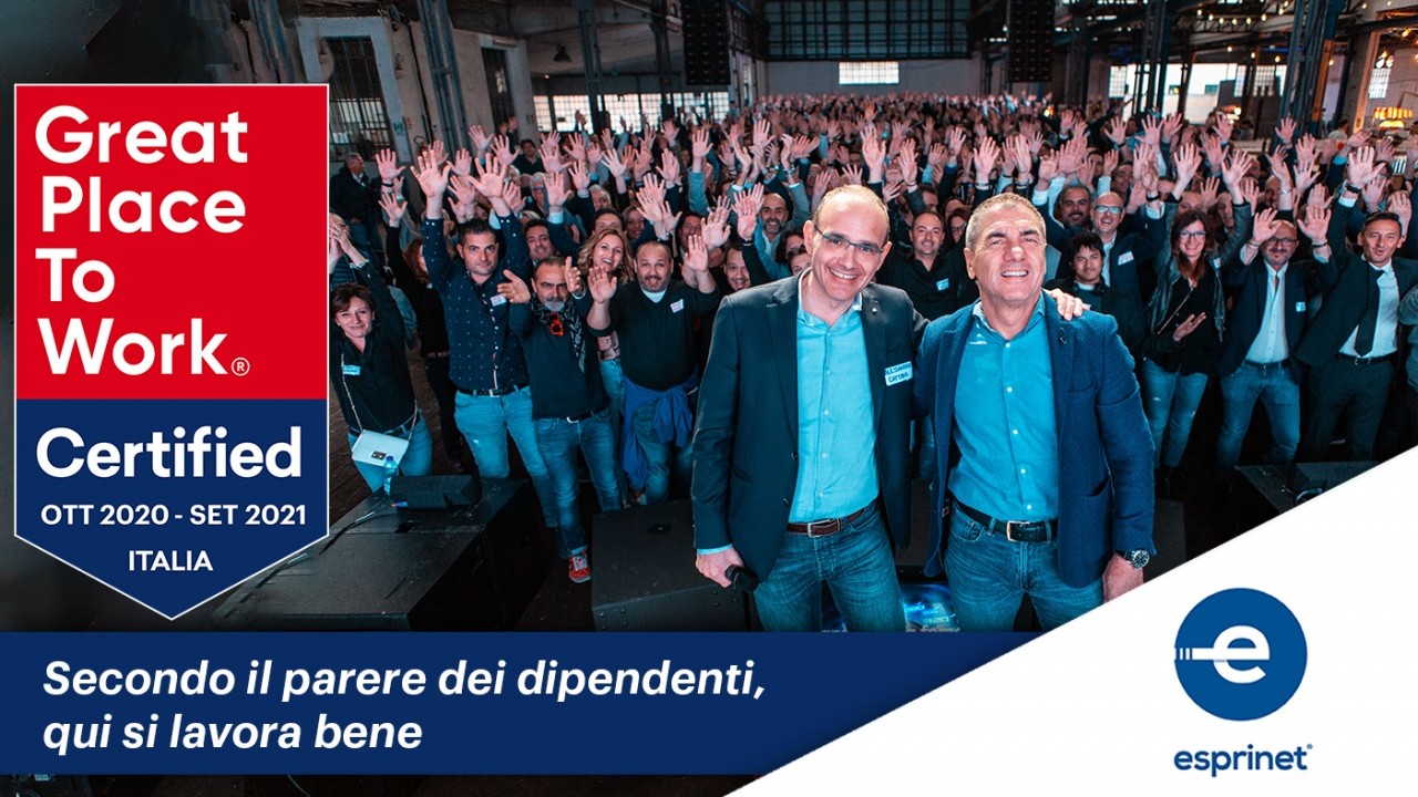 Largo allo smart working Da due anni infatti Esprinet (che quest'anno festeggia 20 anni di attività) ha iniziato a permettere ai propri dipendenti di lavorare per due volte alla settimana da un luogo privato fuori dalla sede di lavoro. Durante il lockdown, la continuità operativa è stata garantita da 1.200 utenti collegati contemporaneamente, cinque giorni su cinque, mentre dal mese di maggio ad oggi, per garantire un rientro in azienda in totale sicurezza, le persone hanno coniugato l’attività di presenza in ufficio con un importante utilizzo dello smart working. 'Siamo molto orgogliosi di aver ottenuto la certificazione Great Place to Work', ha commentato Ettore Sorace, HR Manager del Gruppo Esprinet.“Questo importante riconoscimento arriva grazie a un percorso intrapreso dall’azienda volto all’ascolto dei bisogni, delle opinioni e delle necessità dei nostri dipendenti. I risultati emersi sono per noi un’ulteriore spinta e stimolo ad attuare nuove iniziative che possano renderci una realtà ogni giorno migliore”.