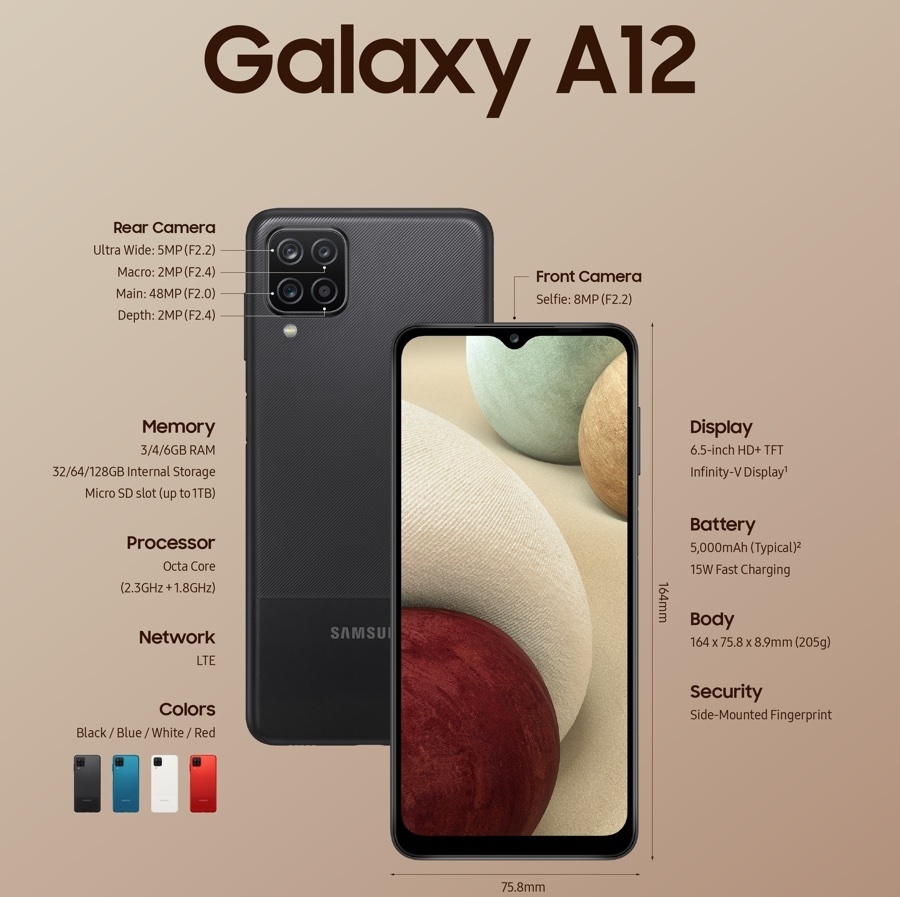 Galaxy A12 e A02s sono caratterizzati da un corpo con un design elegante, che rende i dispositivi confortevoli da impugnare, con una sofisticata finitura opaca sul retro. Sia Galaxy A12 che Galaxy A02s sono disponibili nelle colorazioni bianco e nero, mentre Galaxy A12 è disponibile anche in blu. Galaxy A12 sfrutta inoltre la piattaforma di sicurezza Samsung Knox ed è supportato da un sensore di impronte digitali laterale.