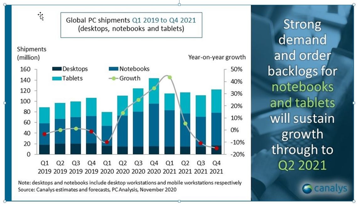 I numeri del quarto trimestre e le previsioni per il 2021. Quando si entrerà nella fase post-COVID, i cambiamenti comportamentali sia tra le aziende che tra i consumatori daranno una maggiore enfasi all’utilizzo del PC, portando a una serie di nuove opportunità non solo nell'hardware, ma anche nel software e nei servizi