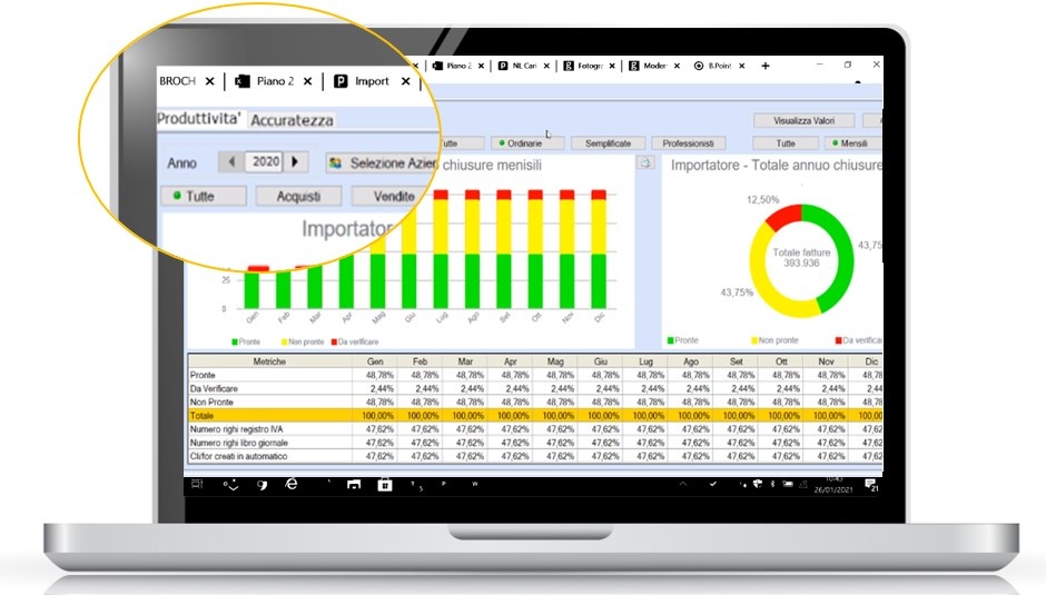 La presenza di dashboard metriche, aggiornate in tempo reale, consente anche la valutazione dell’operatività in termini di produttività e accuratezza. La massa di dati analizzabili permette la valutazione delle attività di studio, i livelli di saturazione e consente al professionista l’analisi congiunta con il cliente-imprenditore del flusso contabile ed amministrativo. L’aumento dell’efficienza operativa, resa possibile da innovativi automatismi, e una nuova capacità di analisi attraverso chiari e immediati dati rappresentati in semplici ed accessibili dashboard sono il più recente tassello della strategia di sviluppo di B.Point nel programma «Con Te».