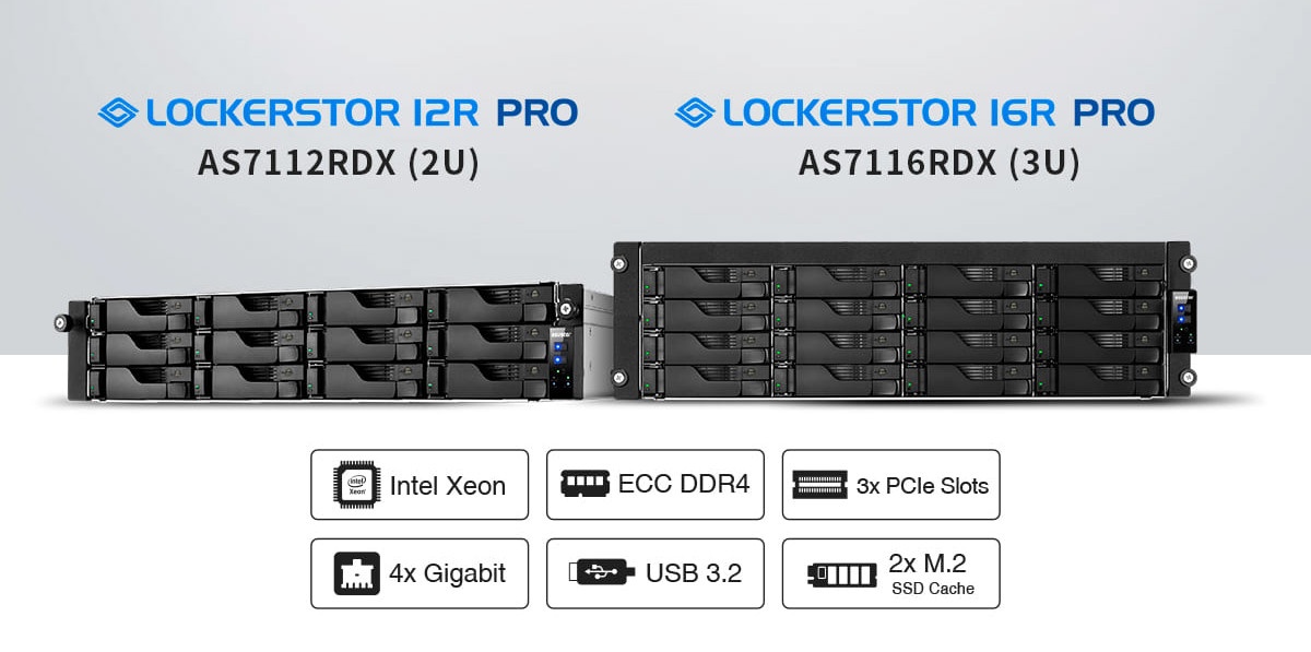 Fiore all'occhiello dell'offerta Asustor, i NAS rackmount modelli Lockerstor 12R Pro e Lockerstor 16R Pro offrono il pieno supporto agli hard disk Segate ST18000NE000 IronWolf Pro da 18 TB e alle unità Western Digital Ultrastar DC HC550, sempre da 18 TB, che consentono di portare le rispettive capacità massime di archiviazione fino a 216 TB e 288 TB.