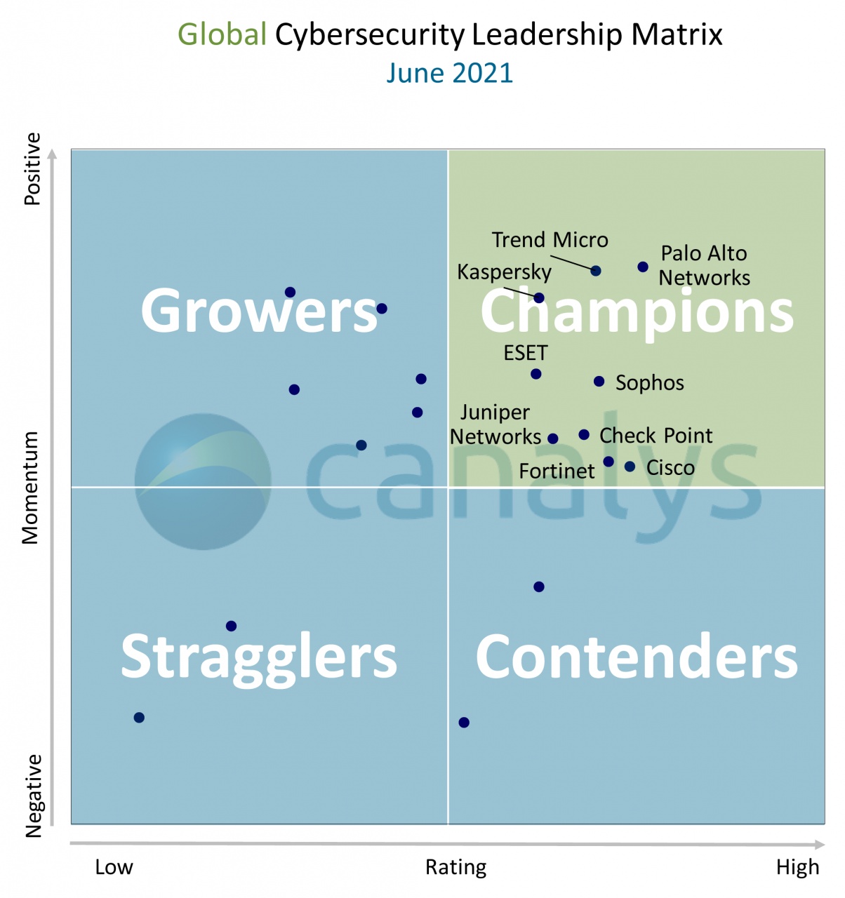Cisco, ESET, Fortinet, Juniper Networks, Kaspersky, Palo Alto Networks e Trend Micro hanno riaffermato le loro posizioni di campioni e sono stati raggiunti da Check Point e Sophos. Sono aziende che hanno mantenuto o esteso le loro posizioni nel mercato della sicurezza informatica attraverso il canale