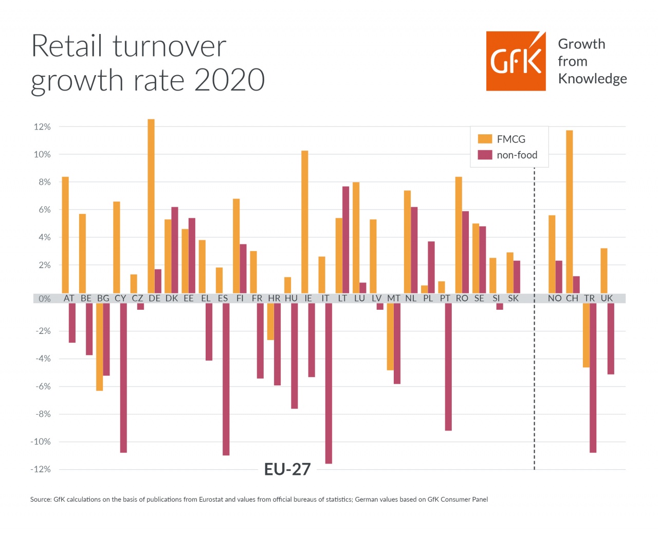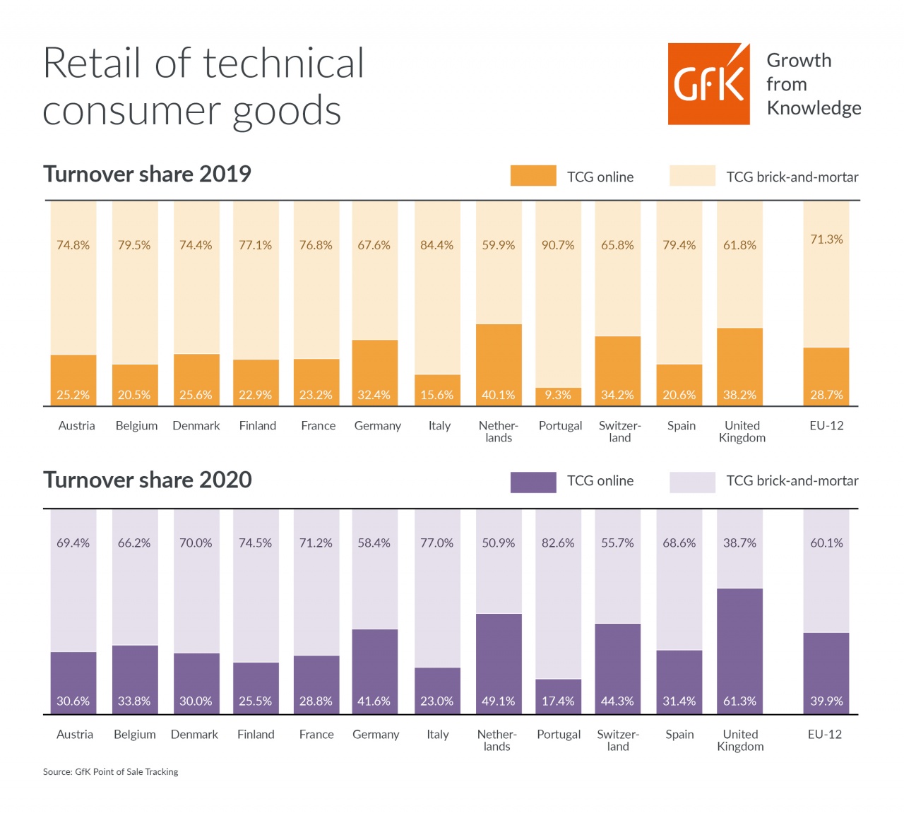 GfK European retail in 2020 and 2021 analizza il potere d'acquisto dei consumatori, il giro d’affari del settore Retail e l’incidenza delle vendite al dettaglio sulla spesa totale della popolazione per il 2020 in Europa. Il report approfondisce inoltre le principali tendenze relative ai Retailer specializzati in Tecnologia di consumo, il potenziale del canale online in Austria e nel Regno Unito (con dettagli a livello regionale) e l’andamento delle frequenze di visita nei centri città nel paese focus di quest'anno, la Germania. I dati relativi a fatturato e potere d'acquisto sono stati convertiti in euro sulla base del tasso di cambio medio di maggio 2021.