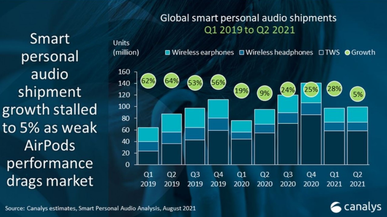 Le spedizioni di dispositivi AirPods TWS sono diminuite del 25,7% per raggiungere 15,0 milioni di unità nel secondo trimestre del 2021, contribuendo alla crescita più lenta del mercato complessivo di TWS in questo trimestre