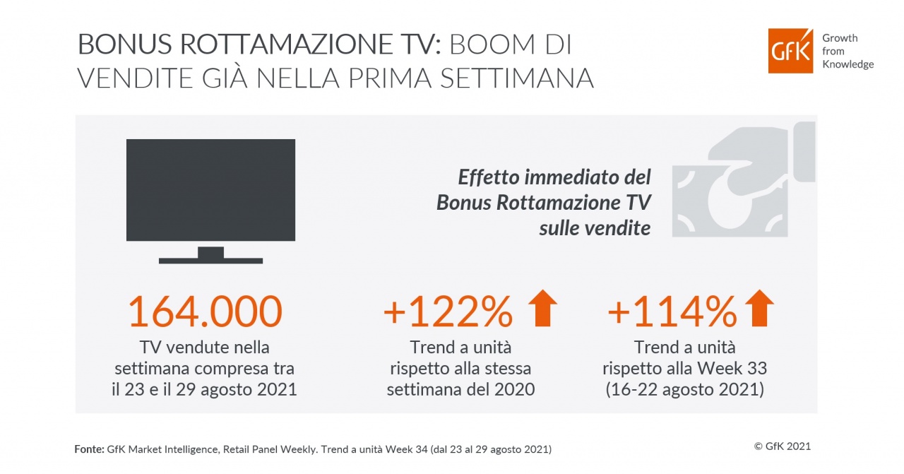 Nella prima settimana di validità dell’incentivo statale per l’acquisto di apparecchi compatibili con il nuovo digitale terrestre, GfK registra una forte crescita delle vendite di Televisori (+122%), con oltre 164.000 unità vendute. Gli italiani hanno deciso di non aspettare e di approfittare subito dell'incentivo statale. Positiva anche la settimana precedente l'entrata in vigore bel Bonus TV (+17,3%) probabilmente per effetto dell'inizio del Campionato di Calcio
