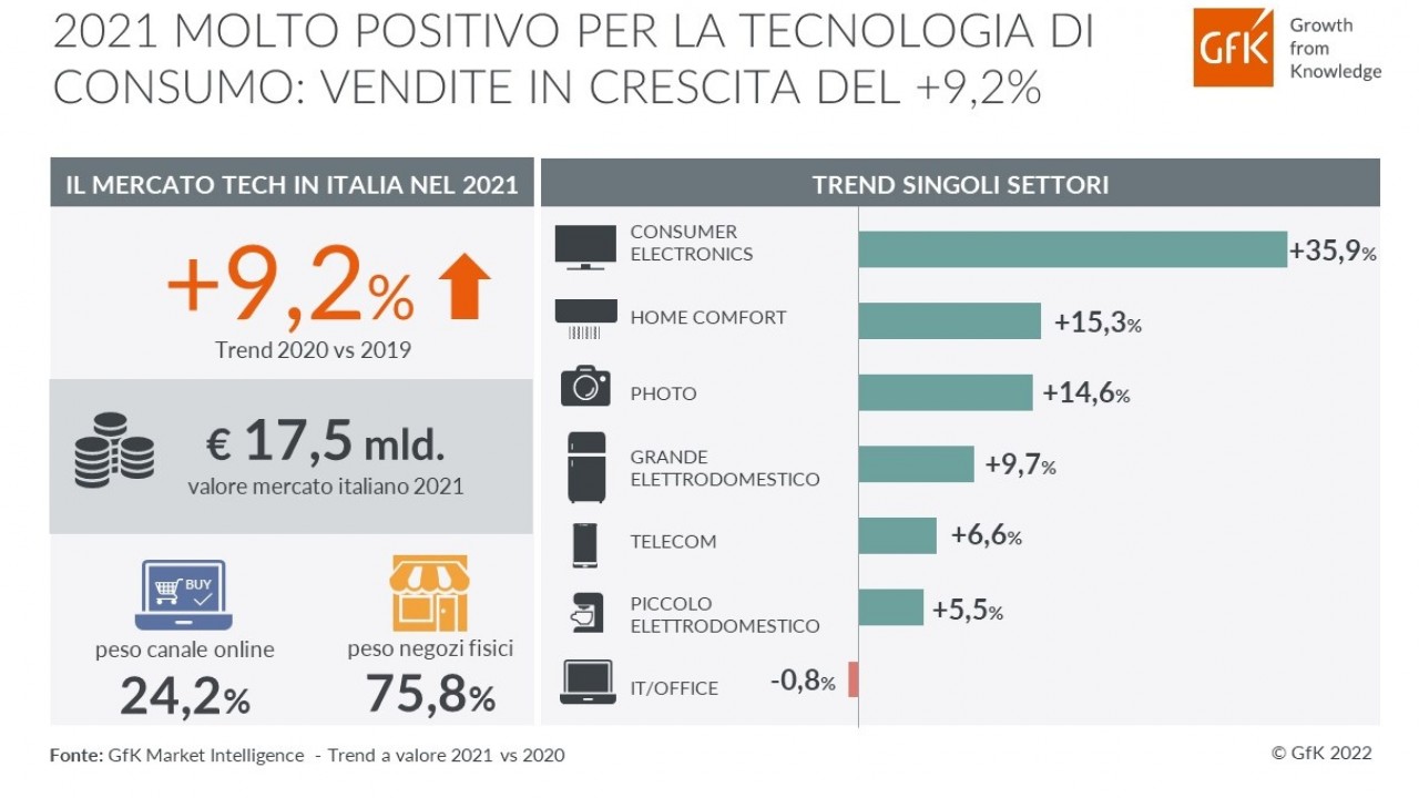 Secondo le rilevazioni GfK, le vendite complessive del settore 'Tecnologia di consumo' nel 2021 sono cresciute del +9,2% e il valore complessivo del mercato ha raggiunto quota 17,5 miliardi di euro.