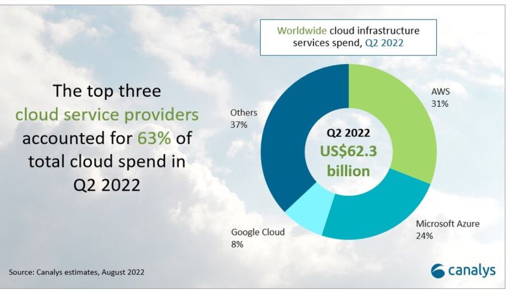 I primi tre fornitori, i cosiddetti hyperscaler, nel secondo trimestre del 2022, ovvero Amazon Web Services (AWS), Microsoft Azure e Google Cloud, insieme hanno rappresentato il 63% della spesa globale nel secondo trimestre del 2022 e per una crescita complessiva del 42%.