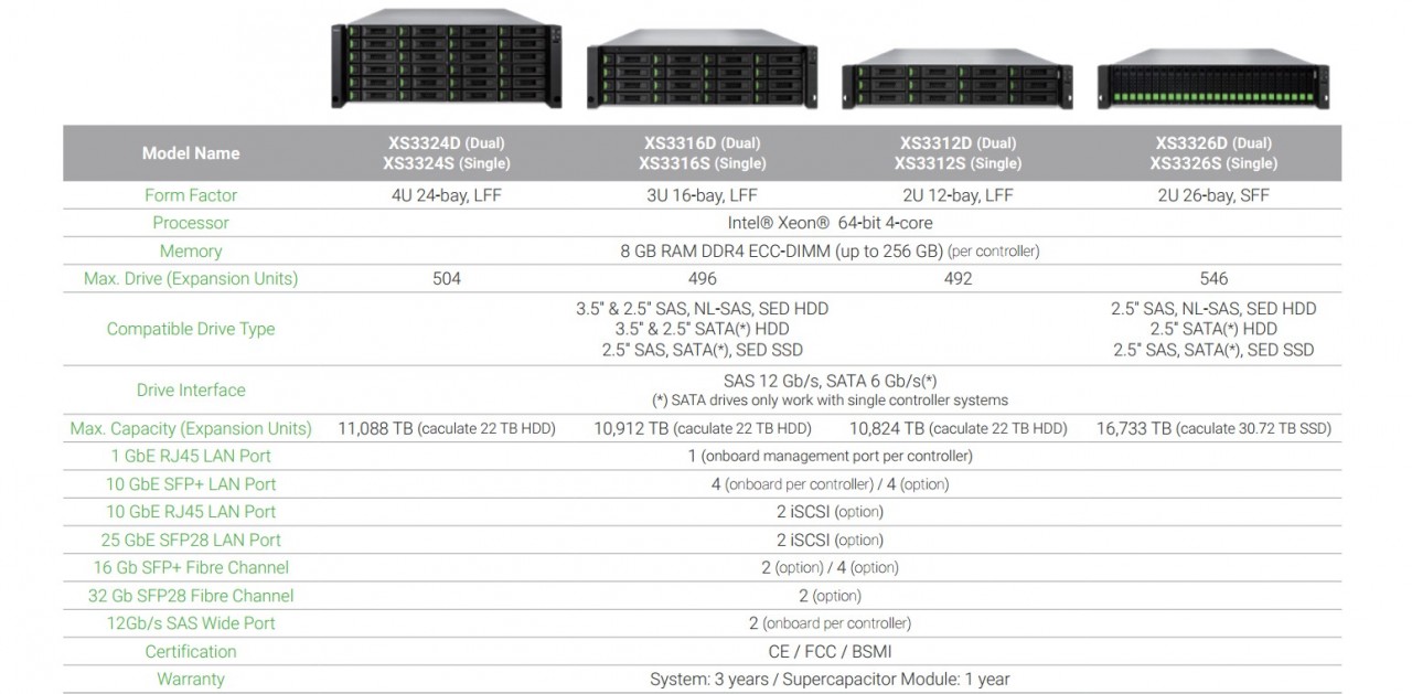 La serie XS3300 subentra in gamma al posto della precedente XS3200, di cui migliora diversi aspetti, a partire dalla dotazione centrale. Il nuovo allestimento, infatti, sfrutta controller dotati di processore Intel Xeon a 4 Core da 2.0 GHz al posto di quelli Intel da 1.6 GHz dei predecessori. La dotazione di memoria spazia ora da 8 a 256 GB, mentre prima si fermava a 128 GB e la base minima era di 4 GB. Anche la connettività compie un deciso balzo in avanti, raddoppiando i connettori onboard, che passano dai quattro 10GbE Base-T dell’XS3200 agli 8 10 GbE SFP+ iSCSI dell’XS3300.