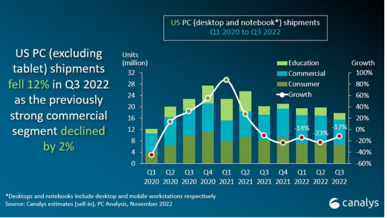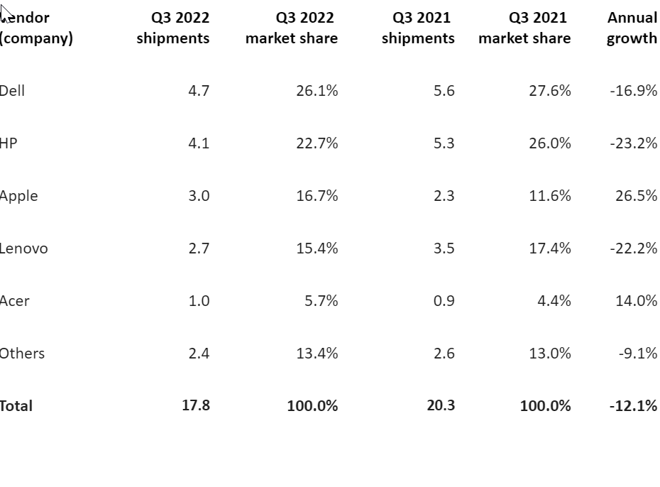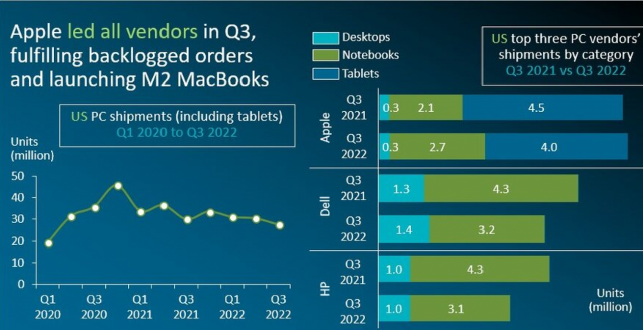 Dell ha mantenuto il primo posto nel mercato statunitense di desktop e notebook nel terzo trimestre con una quota di mercato del 26%, ma le sue spedizioni sono diminuite del 17% su base annua. HP ha spedito 4,1 milioni di unità per assicurarsi il secondo posto, ma ha subito il calo maggiore tra i primi cinque fornitori, con spedizioni in calo del 23%. Apple ha ottenuto buoni risultati nel terzo trimestre con una crescita del 26%, in quanto ha beneficiato dell'evasione degli ordini arretrati da un secondo trimestre a corto di forniture e ha lanciato nuovi dispositivi M2. Lenovo è sceso al quarto posto a causa delle difficoltà nel segmento commercial. Acer si posiziona al quinto posto con una forte crescita del 14%.