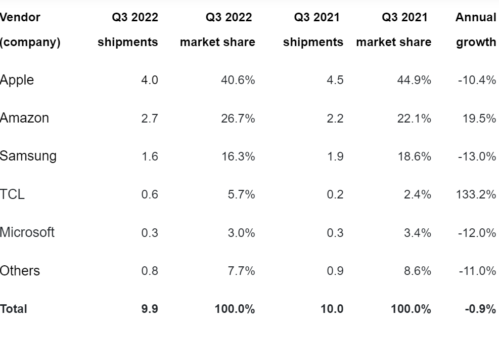 Apple ha mantenuto la posizione di leadership data nel mercato dei tablet negli Stati Uniti con una quota di mercato del 41%. I tablet premium hanno avuto difficoltà a imporsi sui consumatori per i loro prezzi elevati, mentre i tablet più economici hanno ottenuto buoni risultati. Amazon, al secondo posto, si è assicurata una quota di mercato del 27% e ha incrmentato le spedizioni del 20% sulla scia del successo del Prime Day di luglio. Samsung, al terzo posto, con 1,6 milioni di spedizioni, ha subìto un calo annuo del 13%. TCL ha continuato la sua forte impennata con una crescita del 133% mentre ha aumentato gli sforzi di marketing e branding nella regione, mentre Microsoft ha completato i primi cinque con un calo del 12%.