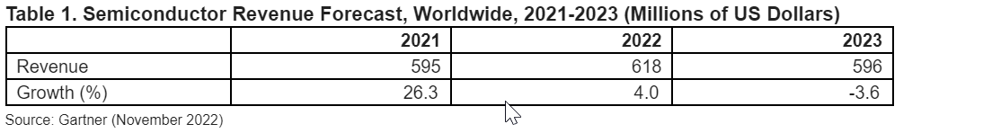 Si prevede che il fatturato globale dei semiconduttori raggiungerà i 596 miliardi di dollari nel 2023, in calo rispetto alla precedente previsione di 623 miliardi di dollari (vedi Tabella 1).![]()