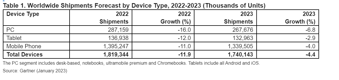Le spedizioni di PC continueranno a registrare il peggior calo di tutti i segmenti di dispositivi nel 2023. Si stima che le spedizioni di PC diminuiranno del 6,8% nel 2023, dopo un calo del 16% nel 2022 (Tabella 1).