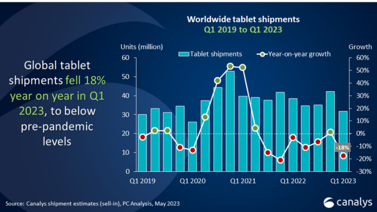 Secondo gli ultimi dati di Canalys, nel primo trimestre del 2023 le spedizioni globali di tablet sono diminuite del 18% rispetto all'anno precedente, raggiungendo 31,7 milioni di unità. Si tratta del numero più basso di spedizioni dall'inizio della pandemia nel primo trimestre del 2020, quando le forniture e la distribuzione sono state pesantemente interrotte. Sebbene nel breve periodo le spedizioni si attesteranno sui livelli precedenti alla pandemia, i vendor beneficeranno delle opportunità offerte dal segmento consumer premium e dall'aumento dell'utilizzo in ambienti commercial e scolastici