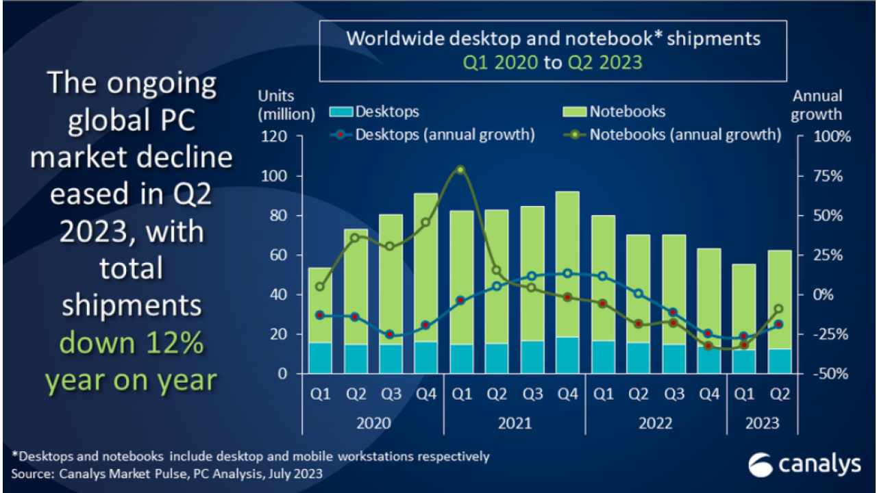 Gli ultimi dati dell'analista di mercato Canalys rivelano che il declino del mercato mondiale dei PC è rallentato nel secondo trimestre del 2023, con un calo delle spedizioni totali di desktop e notebook dell'11,5% su base annua a 62,1 milioni di unità. Un dato che segue due trimestri consecutivi in cui le spedizioni sono diminuite di oltre il 30%. Il volume del secondo trimestre rappresenta un aumento sequenziale delle spedizioni dell'11,9% e indica che il mercato è sulla buona strada per una ripresa accelerata nella seconda metà di quest'anno.