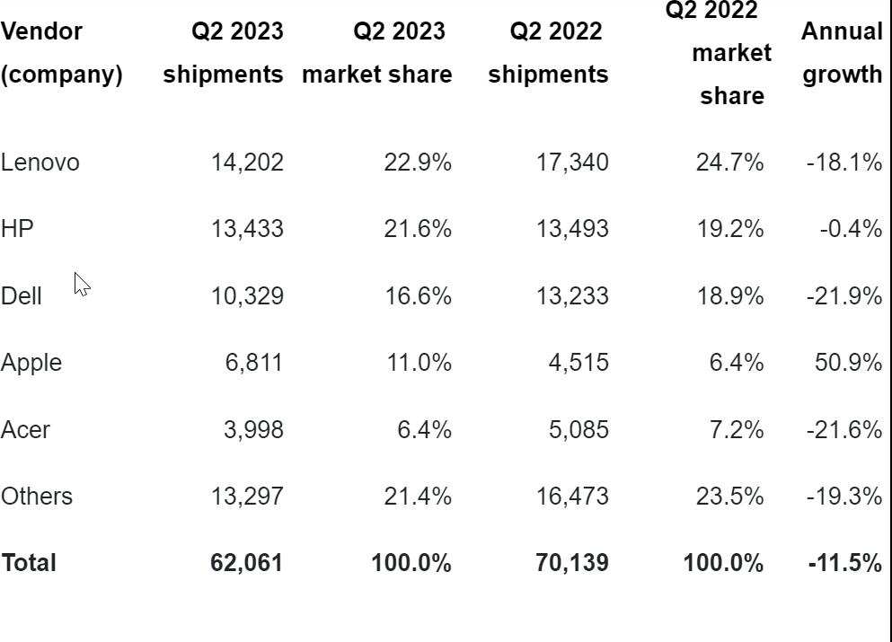 Lenovo continua a guidare il mercato mondiale dei PC, ma ha subìto un forte calo delle spedizioni del 18% rispetto all'anno precedente, scendendo a 14,2 milioni di unità. HP, al secondo posto, ha registrato un trimestre forte, favorito dalle buone vendite di Chromebook negli Stati Uniti. Ha registrato una performance piatta, spedendo 13,4 milioni di unità a livello globale. Dell ha mantenuto il terzo posto, ma ha perso oltre due punti di quota di mercato a causa del calo del 22% delle spedizioni. Apple ha registrato la crescita più elevata tra i principali vendor nel secondo trimestre del 2023, con un aumento delle spedizioni del 51% rispetto all'anno precedente. Sebbene sia stata favorita dal lancio del nuovo Macbook Air da 15 pollici, la sua forte performance è stata determinata soprattutto da un trimestre di confronto favorevole a causa dell'interruzione della catena di fornitura che ha dovuto affrontare lo scorso anno. Acer ha conquistato il quinto posto in classifica, con spedizioni di poco inferiori ai quattro milioni di unità.