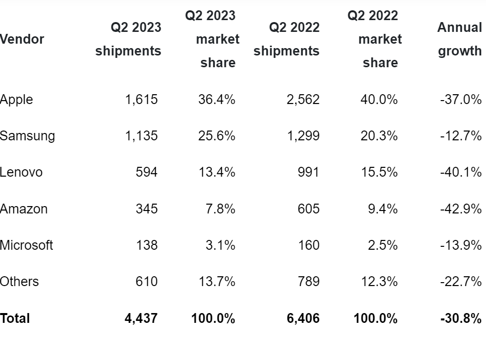 Nel dettaglio, le spedizioni di notebook sono diminuite del 12% a 8,6 milioni di unità nel secondo trimestre del 2023, con prestazioni migliori rispetto ai desktop che ha subito un forte calo del 33% a 1,9 milioni di unità. Nel frattempo, il mercato dei tablet in Europa occidentale si è contratto in modo significativo poiché le spedizioni sono diminuite del 31% a 4,4 milioni di unità.