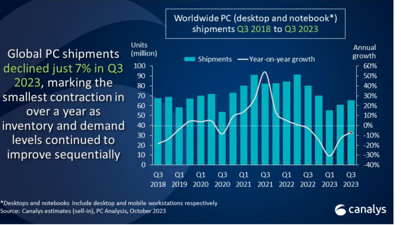 Secondo gli ultimi dati di Canalys, il mercato mondiale dei PC ha registrato un altro miglioramento sequenziale nel terzo trimestre del 2023. Sebbene le spedizioni totali di PC pari a 65,6 milioni di unità siano diminuite del 7% su base annua, sono aumentate dell'8% rispetto al secondo trimestre del 2023. Si tratta del minore calo annuale delle spedizioni per il settore in oltre un anno ed è un ulteriore segnale di ripresa sia dei livelli delle scorte che della domanda. Le spedizioni di notebook sono diminuite del 6% annuo a 52,1 milioni di unità, mentre le spedizioni di desktop sono diminuite dell'8% a 13,5 milioni di unità.