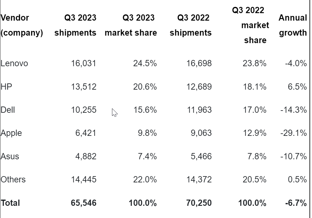 Lenovo è in testa alla classifica di mercato nel terzo trimestre del 2023, spedendo 16 milioni di unità e registrando un calo annuo relativamente modesto del 4%. HP, al secondo posto, ha goduto di un altro trimestre di crescita, con le sue spedizioni in crescita del 7% annuo a 13,5 milioni di unità. Dell si è classificata al terzo posto, subendo un calo delle spedizioni più pesante del 14%. Apple, al quarto posto, ha registrato il calo maggiore su base annua nelle spedizioni del 29% a 6,4 milioni di unità. Tuttavia, ciò è stato in gran parte determinato dal confronto con il trimestre forte dello scorso anno, quando si è riusciti a rispondere alla domanda repressa a seguito delle interruzioni della catena di approvvigionamento. Asus ha completato i primi cinque vendor, spedendo 4,9 milioni di unità.