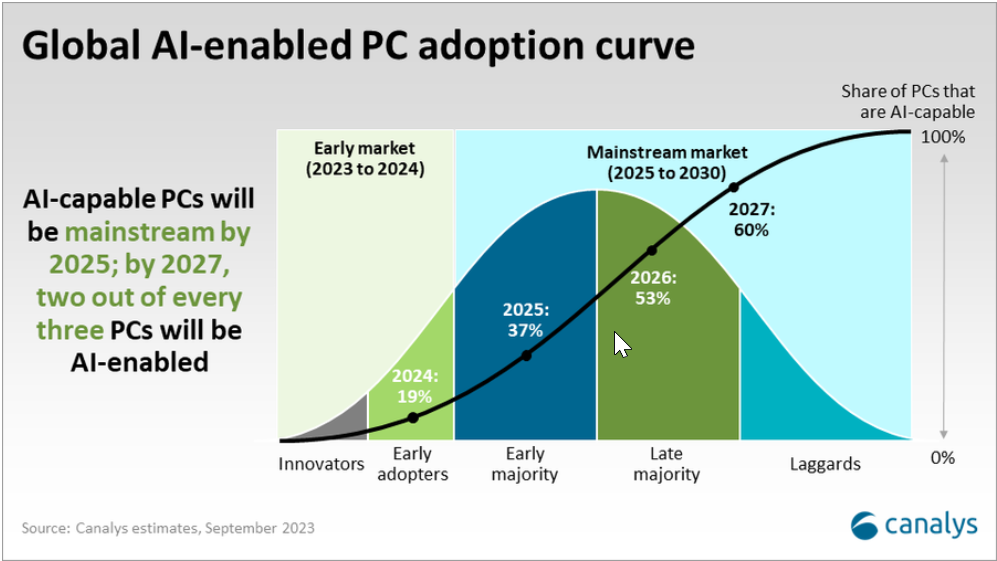 “Con l’attenuarsi di molti dei problemi che hanno afflitto il mercato, i vendor dell’ecosistema PC possono ora aspettarsi un ulteriore aumento della domanda legata all’intelligenza artificiale”, ha affermato Kieren Jessop, analista di ricerca presso Canalys. “Le tabelle di marcia per l’integrazione delle funzionalità AI sui dispositivi sono già state delineate, con diversi prodotti presentati all’evento HP Imagine all’inizio di questo mese e altri fornitori pronti a seguire l’esempio. Canalys prevede che l’adozione di PC compatibili con l’intelligenza artificiale subirà un’accelerazione dal 2025 in poi, con tali dispositivi che rappresenteranno circa il 60% di tutti i PC spediti nel 2027. I vendor e i partner di canale che coglieranno questa opportunità beneficeranno sia dei prezzi più elevati richiesti dai PC compatibili con l’intelligenza artificiale, sia delle più ampie opportunità di fornire servizi e soluzioni oltre all’hardware”.