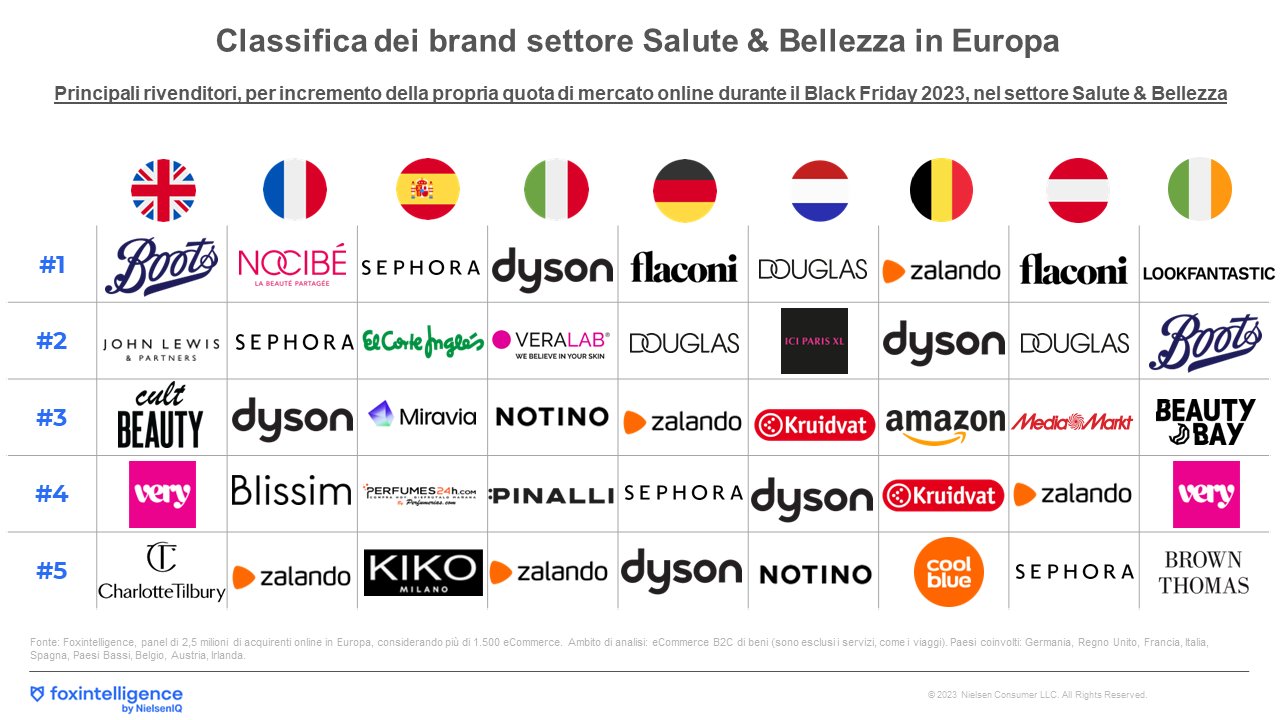 Fonte dati: Foxintelligence by NIQ. L’analisi è stata realizzata su un panel di 2,5 milioni di acquirenti online in nove paesi dell’Europa occidentale (Italia, Francia, Germania, Spagna, Regno Unito, Irlanda, Austria, Paesi Bassi e Belgio), considerando oltre 1500 eCommerce. Periodo di riferimento: dal 17 al 26 novembre 2023.