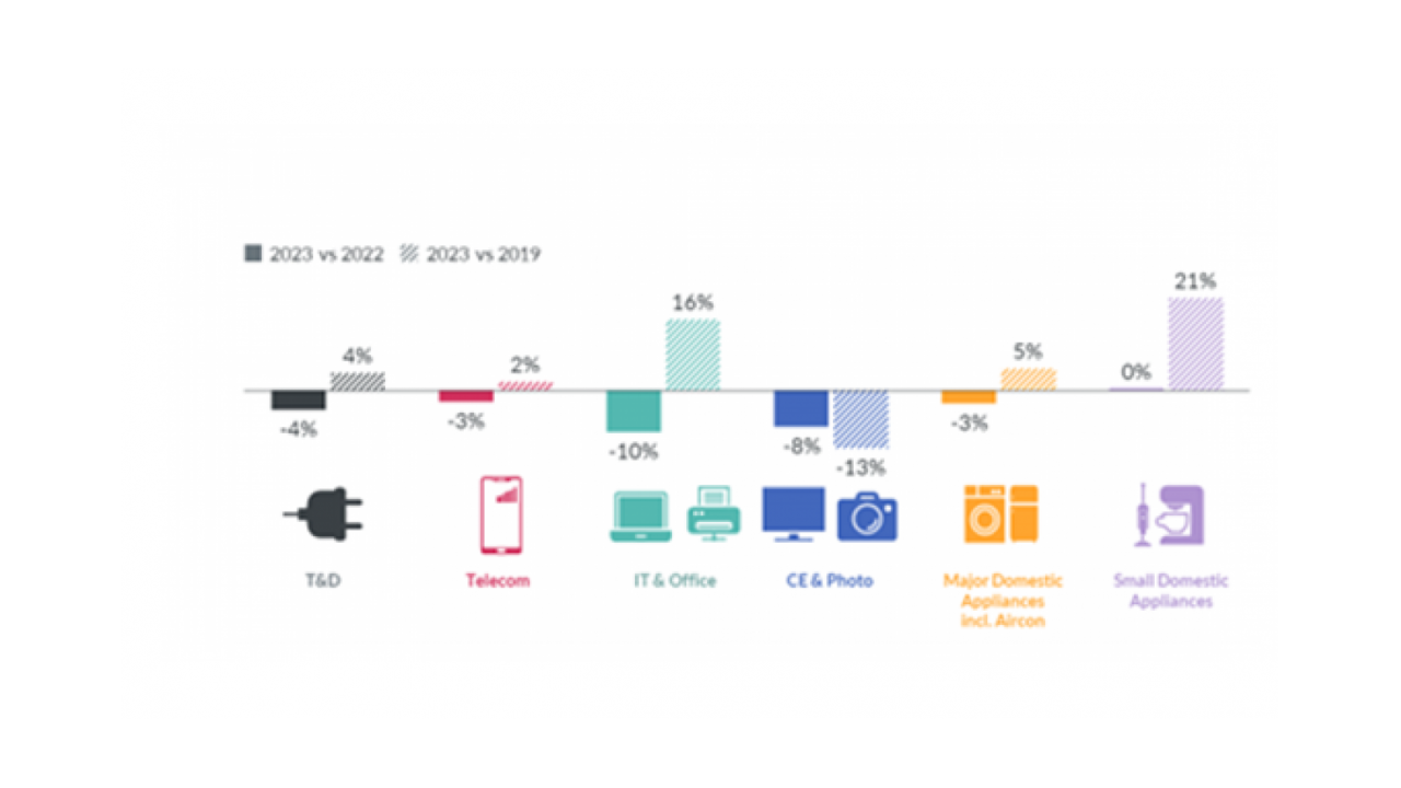 Nonostante le aspettative per il 2023 siano piuttosto negative, il fatturato globale sarà ancora al di sopra dei livelli pre-pandemici del 2019. Questo grazie soprattutto alla crescita dei settori dell’IT & Office e del Piccolo Elettrodomestico, che hanno registrato performance ben superiori ai ricavi del 2019, rispettivamente con un +16% e un +21%. L'Elettronica di consumo (CE), invece, si è mantenuta debole.