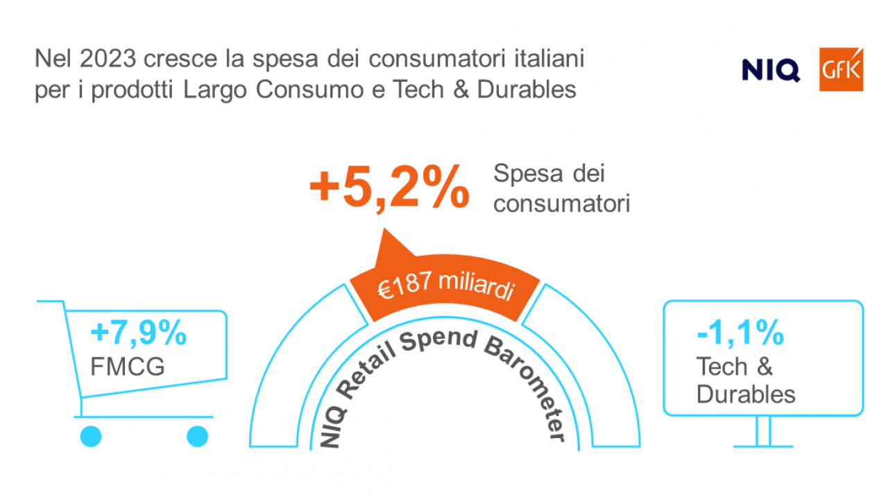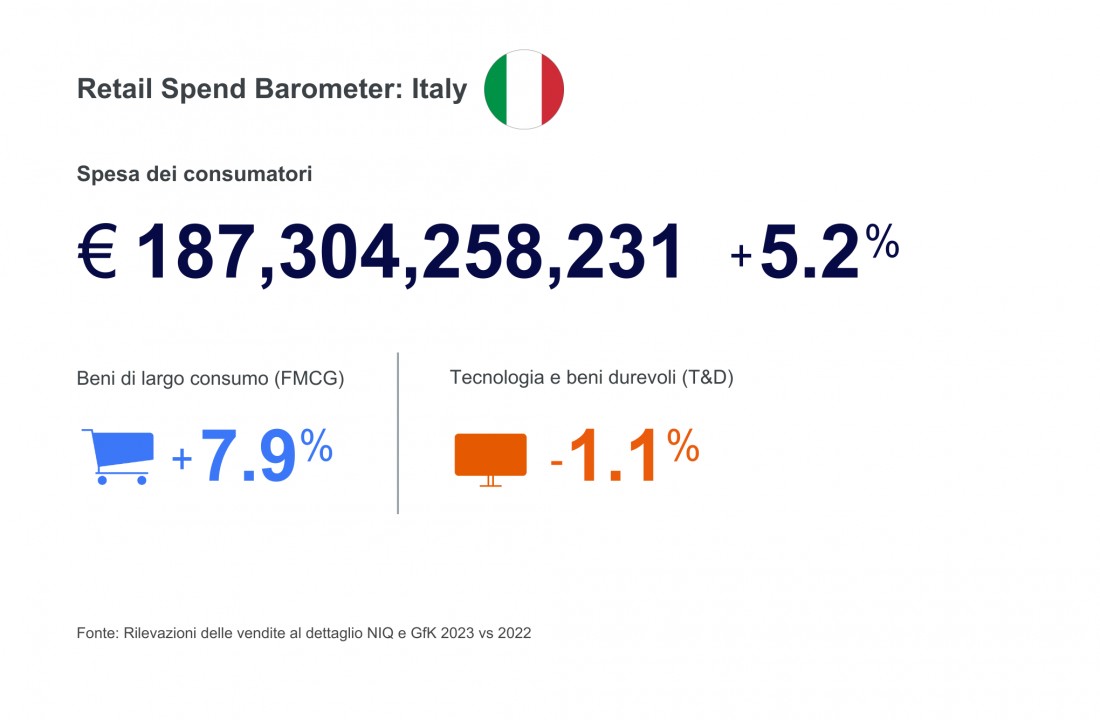 In Italia, la spesa dei consumatori per i beni di largo consumo (FMCG) e per i beni tecnologici e durevoli (T&D) è aumentata del 5,2% rispetto al 2022, registrando un fatturato complessivo di 187 miliardi di euro. L'aumento è stato determinato in particolare dalla crescita del prezzo dei prodotti alimentari e per la cura della persona, mentre gli italiani sono rimasti più cauti nelle spese di alcuni prodotti T&D.