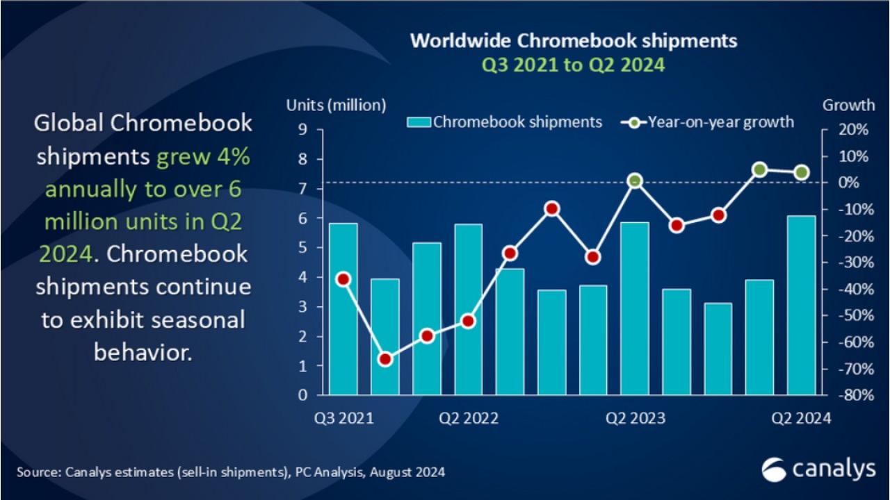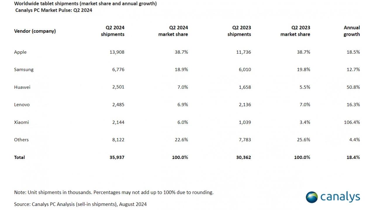 Secondo gli ultimi dati di Canalys, nel secondo trimestre del 2024 le spedizioni di tablet a livello mondiale sono aumentate del 18% rispetto all'anno precedente, raggiungendo 35,9 milioni di unità. Allo stesso tempo, le spedizioni di Chromebook sono cresciute del 4%, raggiungendo 6,0 milioni di unità, grazie al ritorno del mercato dell'istruzione ai tipici modelli di spesa stagionali.