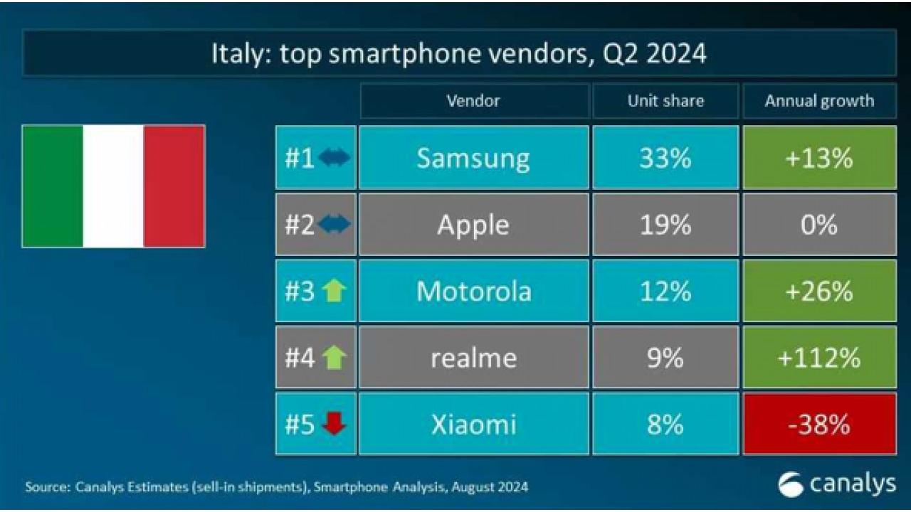 I dati del secondo trimestre del 2024 per il mercato italiano degli smartphone evidenziano un panorama contrastante, in cui la maggior parte dei brand più importanti ha registrato una crescita non superiore al 30%. In particolare, Apple rimane stabile e Xiaomi registra un calo del 38% rispetto all'anno precedente. realme supera i concorrenti con una crescita sorprendente del 112%.