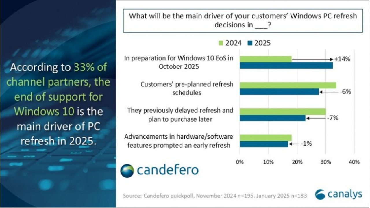 “Con l'avvicinarsi della scadenza per la fine del supporto di Windows 10, questo sta emergendo come il principale catalizzatore di refresh tra i partner”, ha dichiarato Jessop. Secondo un sondaggio condotto a gennaio tra i partner di canale, un terzo ha citato Windows 10 EoS come il principale fattore di decisione dei loro clienti per il refresh nel 2025. “Molti di questi partner prevedono che la maggior parte dei refresh dei loro clienti avverrà nella seconda metà del 2025”, ha aggiunto Jessop. “Tuttavia, gli incombenti cambiamenti della politica commerciale negli Stati Uniti minacciano di sconvolgere il mercato che rappresenta circa un PC su tre, e potrebbero ostacolare il prossimo ciclo di aggiornamento commerciale e smorzare le prospettive dei consumatori, già in calo. Finora l'amministrazione Trump ha imposto una tariffa del 10% su tutte le importazioni cinesi, che rappresentano la maggioranza significativa dei laptop spediti negli Stati Uniti”.