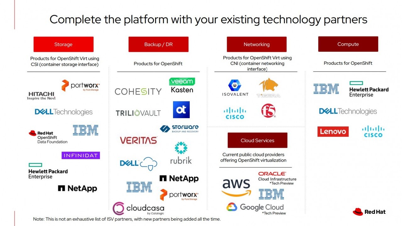 Il modello comune di partnership è fondamentalmente basato sull’integrazione dell’offerta a livello applicativo. Ciò che serve è che tutta l’offerta Red Hat - sistema operativo, piattaforma di sviluppo e soluzione di virtualizzazione - si amalgami facilmente e senza intoppi in qualsiasi ambiente cloud (ibrido), che siano pronti i vari connettori con tutti i maggiori fornitori di tecnologia e che l’hardware sia all’altezza delle esigenze di calcolo, di storage e di networking delle piattaforme del leader dell’open source.