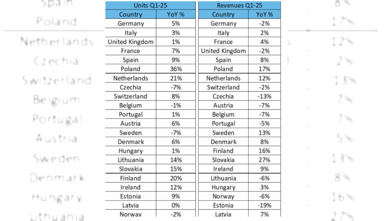 A livello geografico, le performance sono state contrastanti. Mentre la Spagna ha registrato una forte crescita nel 1° trimestre, il suo slancio si è affievolito. La Germania e la Francia sono vicine ai livelli del 2024, mentre l'Italia e la Polonia in alcuni momenti hanno persino superato i dati del 2023. Il Regno Unito ha mantenuto una traiettoria più stabile, in linea con lo scorso anno.
