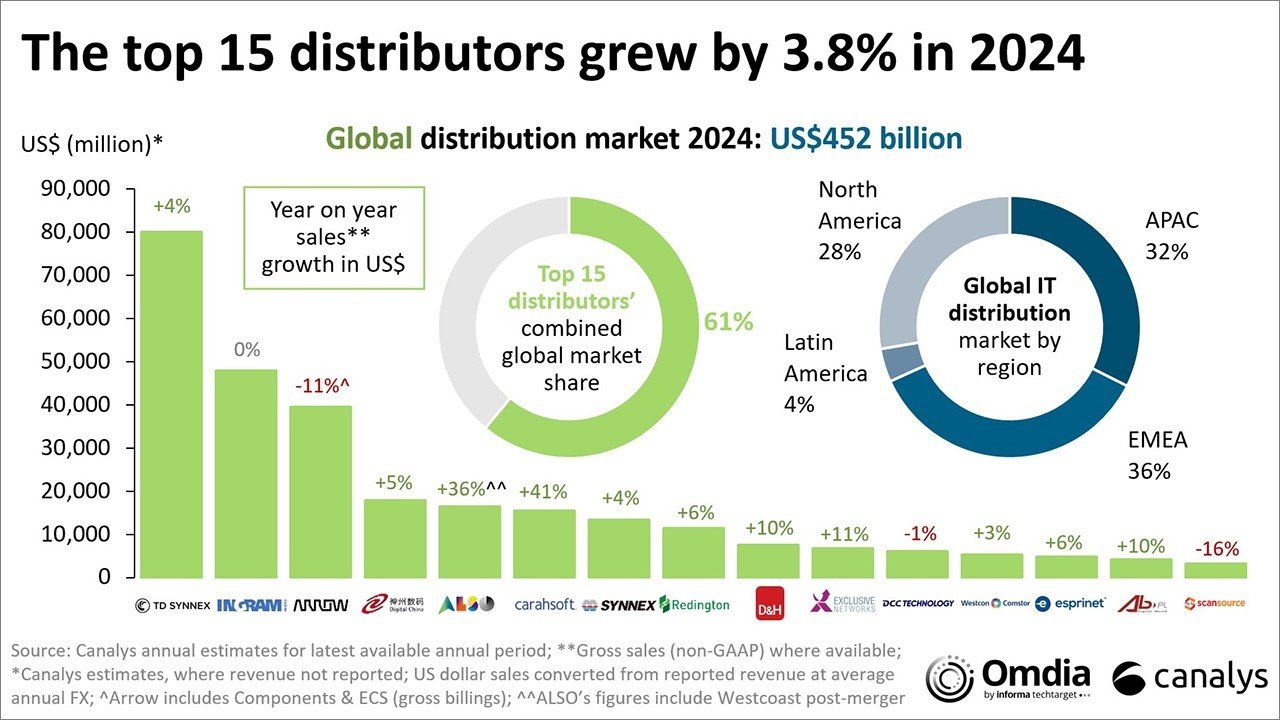 Queste le tesi principali di un recente post sul blog di Canalys, firmato dai due chief analyst Alastair Edwards e Jay McBain, che inizia con due elementi molto significativi del mercato mondiale della distribuzione IT. Uno è il valore, che nel 2024 è stato di 452 miliardi di dollari, di cui il 36% in EMEA, il 32% in Asia-Pacifico, e il 28% nel Nord America.