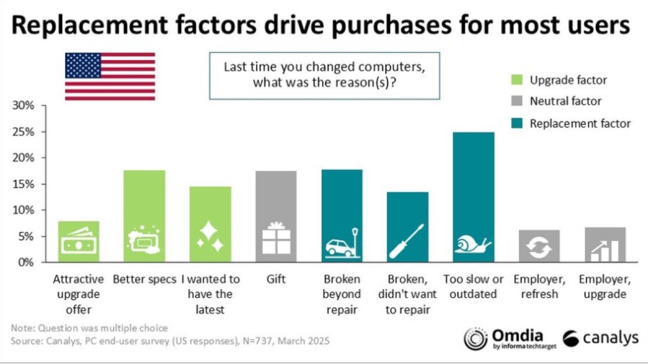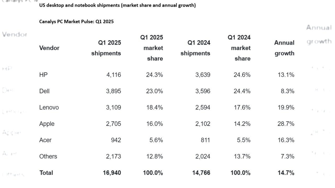 L'analista di mercato Canalys, ora parte di Omdia, indica che le spedizioni di desktop e notebook negli Stati Uniti sono cresciute del 15% su base annua nel primo trimestre del 2025, raggiungendo 16,9 milioni di unità. Un'impennata nell'attività di sell-in da parte dei vendor, dovuta agli sforzi per gestire gli annunci tariffari, ha portato a un significativo accumulo di scorte che ora dovranno essere smaltite. Questo, insieme alla pressione al ribasso sulla spesa dei consumatori, porterà a un rallentamento del mercato per il resto dell'anno, con una previsione di aumento delle spedizioni totali di PC nel 2025 di appena il 2% annuo. Poiché una parte considerevole dell'attività di aggiornamento di Windows si verificherà dopo la scadenza del termine di supporto di Windows 10 nell'ottobre 2025, si prevede che la crescita nel 2026 sarà del 4%.