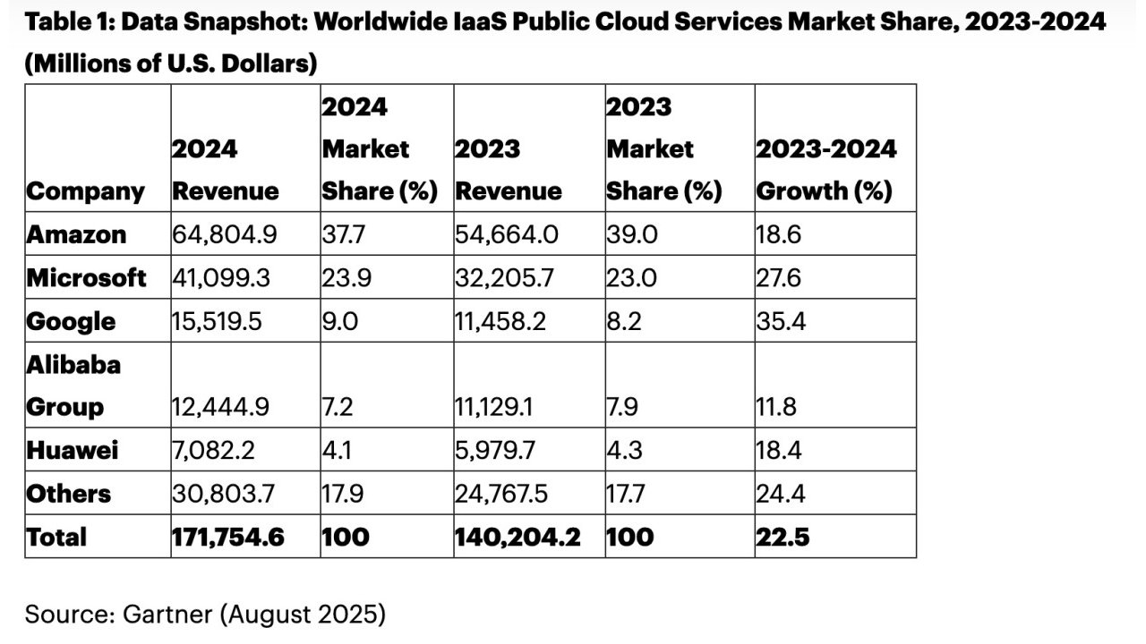 Secondo Gartner il mercato mondiale dei servizi public cloud di infrastructure-as-a-service (IaaS) è cresciuto del 22,5% nel 2024, raggiungendo i 171,8 miliardi di dollari. Amazon Web Services (AWS) ha mantenuto la posizione numero 1, seguita da Microsoft, Google, Alibaba e Huawei.