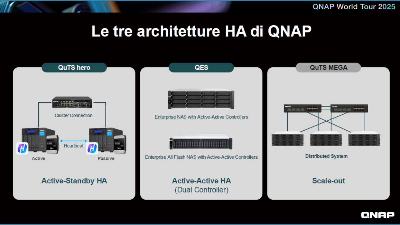 QNAP ha mostrato le evoluzioni delle architetture Active-Active e Active-Passive, insieme ai nuovi sistemi enterprise NAS con doppio controller, pensati per garantire continuità del servizio e integrità dei dati anche in ambienti mission-critical.