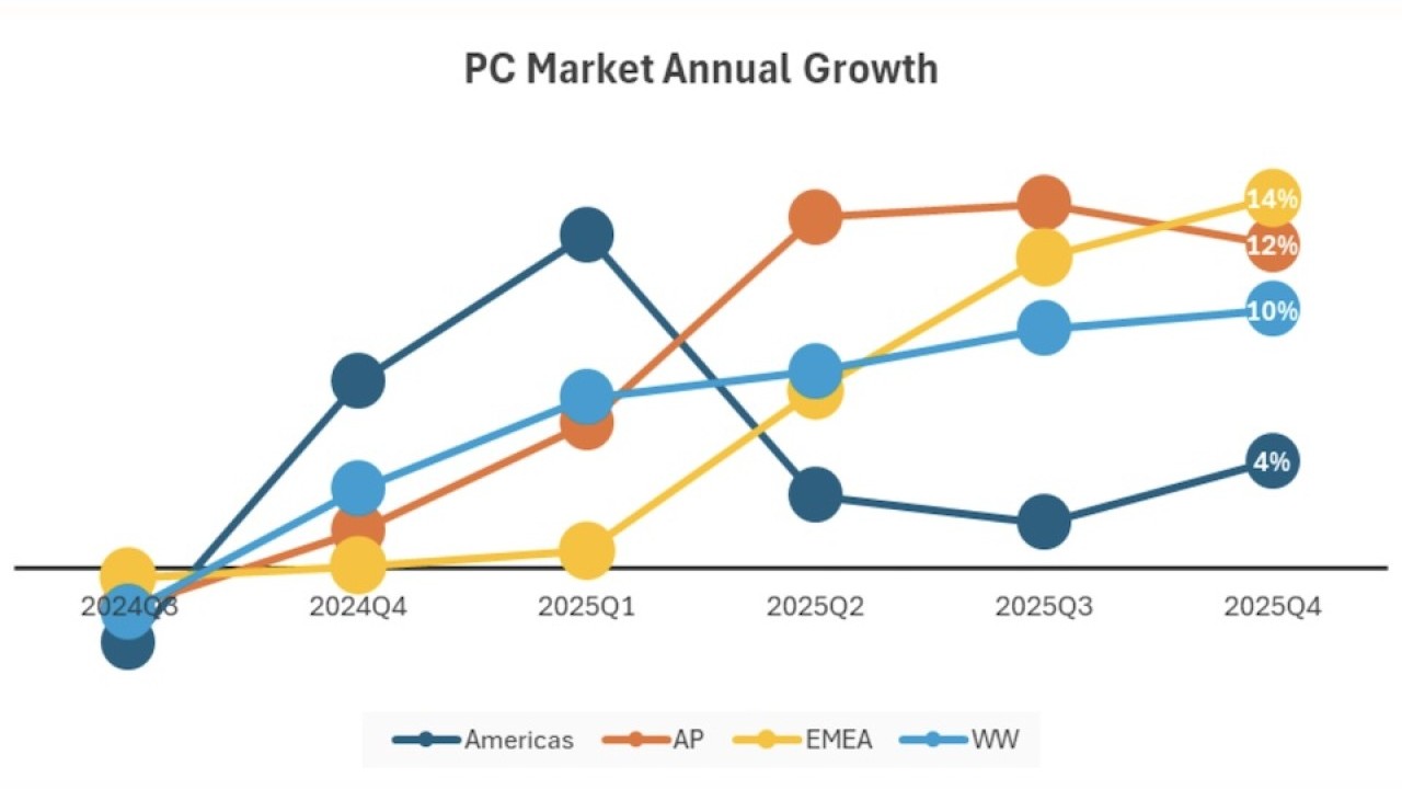 Questi dati sono il risultato di un anno molto movimentato per il mercato dei PC, caratterizzato dalla fine del supporto per Windows 10, che ha generato un'ondata di domanda di aggiornamenti, e dalle preoccupazioni sui dazi di inizio anno che hanno spinto i fornitori ad anticipare più scorte di quanto inizialmente previsto. Altro fattore di estrema rilevanza è la crescente carenza dei componenti, soprattutto di memoria, che ha amplificato la consueta forte domanda nel periodo natalizio, e ha spinto acquirenti e marchi ad assicurarsi scorte in vista degli aumenti di prezzo previsti per il 2026.