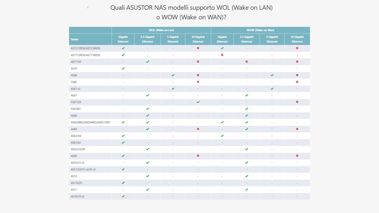 Maggiori informazioni relativamente al supporto Wake On Wan per singole serie di NAS sono disponibili al seguente link: https://www.asustor.com/it/solution/wake_on_wan