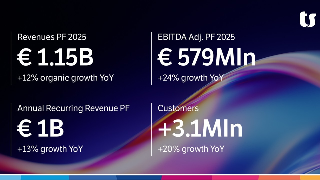 Fatturato: 1.15 miliardi di euro (+12% crescita organica YoY); clienti: 3,1 milioni (+20% YoY). Significativa crescita internazionale: ricavi esteri +35% crescita organica YoY, pari al 24% dei ricavi complessivi del Gruppo. Lanciate 8 nuove AI edition con 200.000 interazioni medie giornaliere in crescita del 37% sul trimestre precedente