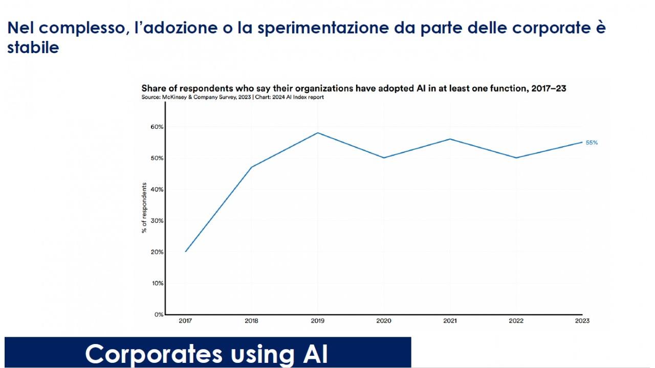 E ancora: come procedono gli investimenti in in questi ambiti? Se si osservano solo i numeri in realtà nell’ultimo biennio gli investimenti sono stati in discesa. Ma non è una brutta notizia in sé, ma il sintomo del fatto che gli investimenti in intelligenza artificiale sono diminuiti mentre sono esplosi quelli in intelligenza artificiale generativa, su cui oggi sono indirizzati gli investimenti delle aziende. In particolare, la maggioranza degli investimenti sono concentrati negli Stati Uniti, mentre Europa e Cina sono parecchio in ritardo in questa direzione. L’italia non compare neeanche nello spaccato europeo, paese per paese. Questo è lo spaccato per paese, come vedete, non ci sono negli italiani.