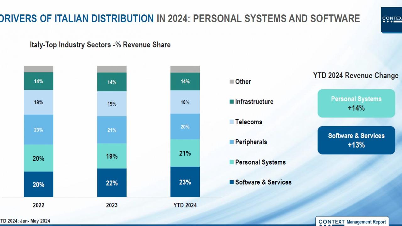 Riguardo ai segmenti, l’area software & servizi detiene, all'interno del totale della distribuzione, una quota del 23% con una crescita, anno su anno, di oltre il 13%. Con una quota del 21% l’ambito personal systems, in crescita di oltre il 14%. Al 20% le telecom (inclusi gli smartphones e le infrastrutture) in crescita del 18%. Questi due ultimi comparti, al momento, nel 2024, sono negativi.
