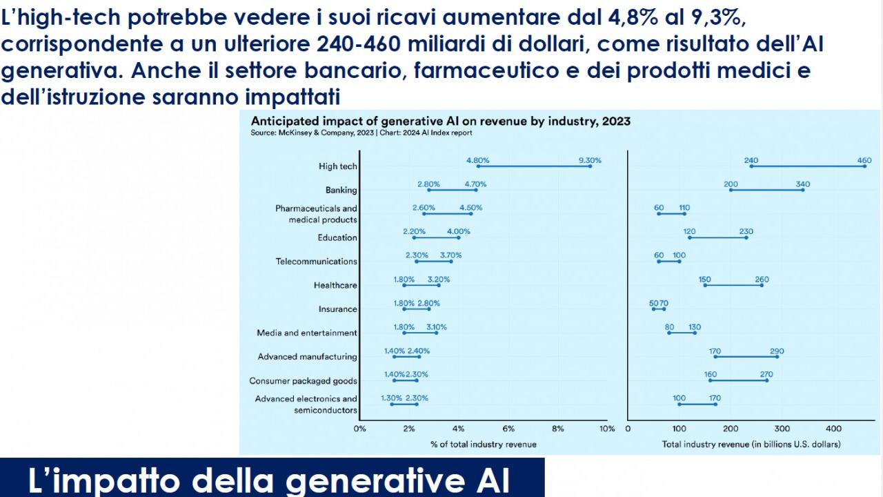Parte Francesco Sacco con la risposta a una domanda provocatoria: Ma l’AI è l’ennesima bolla tecnologica/finanziaria?: “Osservando l’andamento dell’AI al momento siamo su un picco, e l'Italia è in questa bolla. Cosa significa in termini concreti? Nella storia dell'umanità le bolle sono nella natura dell'uomo: quando si manifestano queste opportunità di fare business si crea euforia, e, nell'euforia, l'investimento è sempre maggiore di ciò che dovrebbe essere razionale fare. In realtà, però, tutte le grandi rivoluzioni tecnologiche sono arrivate con delle bolle: il motore a scoppio, l'elettricità, il telegrafo, il telefono, internet,…: fenomeni arrivati dopo un momento di iper-investimento. E’ il caso, per esempio dell’affermarsi di Facebook così come di Google, arrivati dopo lo scoppio della new economy. Dopo l’euforia generalmente segue una fase di ‘sboom’, durante la quale i prezzi tendono ad abbassarsi di molto, ed è allora che parte il vero mercato. Nel momento in cui scoppia la bolla inizia quindi la vera rivoluzione”. Ora si tratta di capire se è una rivoluzione industriale che porterà valore.