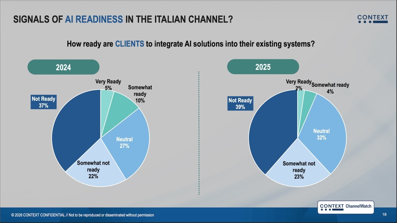 Quanto ai clienti finali, il 6% dei reseller li ritiene pronti o abbastanza pronti per l’AI (l’anno scorso era il 15%), il 62% non pronti (era il 59% nel 2024).